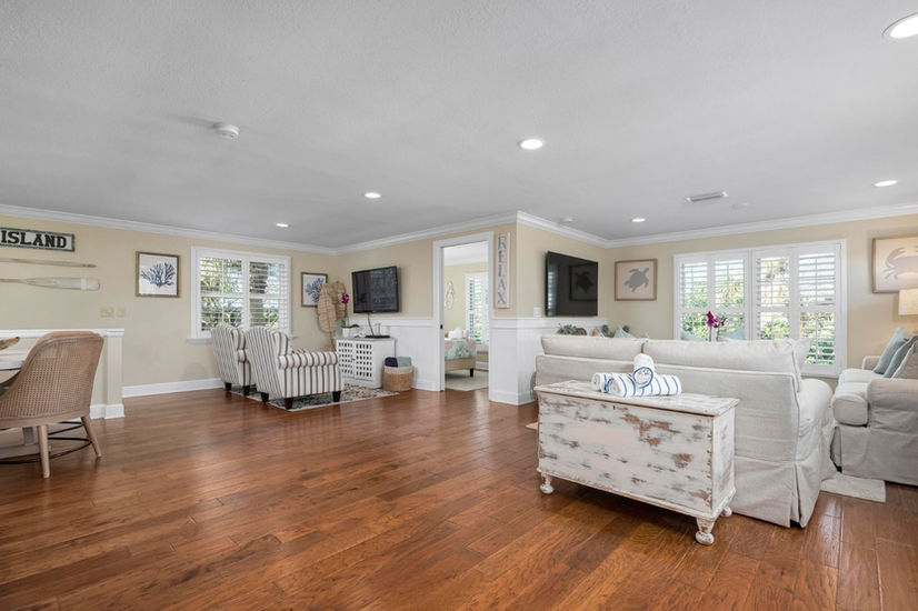 The fully equipped kitchen boasts stainless steel appliances, making it easy to whip up a gourmet meal. There's room to dine at table for four, with additional seating at the breakfast bar, or enjoy dining poolside on the expansive and covered back patio—complete with dining table for 6 and outdoor TV for ultimate entertainment. When you’re ready to explore, you’re just a short walk or drive to some of the island’s most beloved restaurants, including The Waterfront, Slim’s Place, and The Porch.