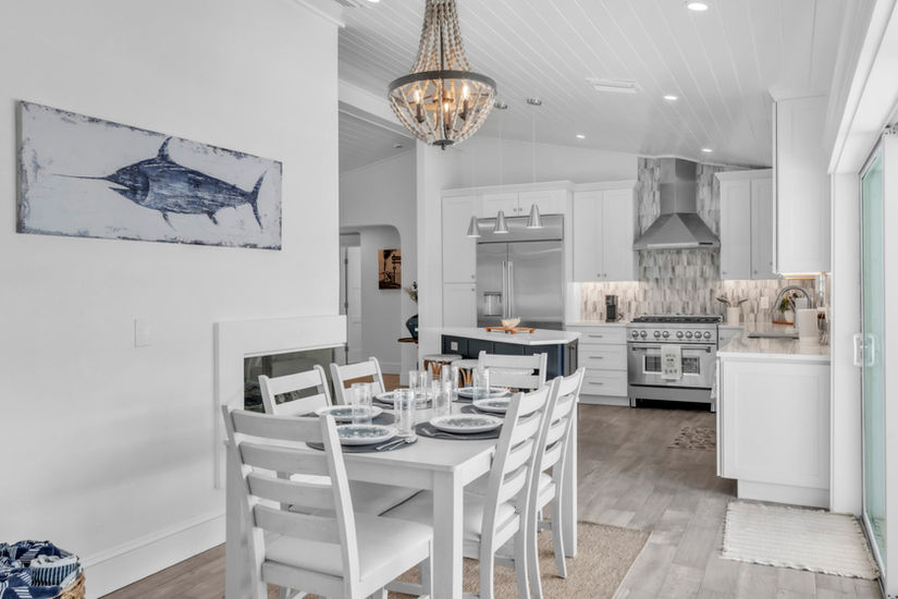 Step inside and you’ll immediately notice the open, airy layout and upscale finishes throughout. The spacious living room offers plush seating and a flat-screen TV, ideal for relaxing after a day on the water. Just beyond, the dining room opens directly to the backyard through wide sliding doors, creating a seamless connection between indoor and outdoor living.