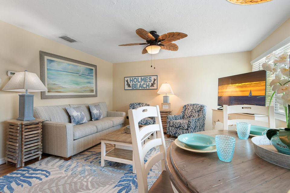 Centrally located in Holmes Beach, this elevated home is the perfect retreat! Updated throughout and furnished in bright, coastal colors, you will feel right at home here for your beach getaway! Inside the house each side has a split plan with a king sized bedroom. The 3rd and 4th bedrooms feature comfy queen beds.