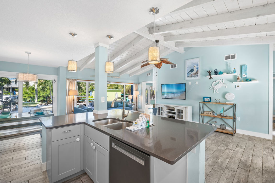 H2O 360 sleeps plenty of guests in one of the three tropical bedrooms. Relax in one of the two king bedrooms which each provides a convenient desk for the occasional work from home necessity. Kids will love the nautical themed custom bunk beds in the third bedroom with twin trundles offering a choice for everyone. This room even includes its own cable TV for movie night.