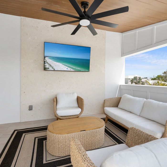 For the ultimate in relaxation, ascend to the top-level balcony lounge - a true delight. This unique outdoor living room is furnished with plush seating, a large flat-screen TV, and a ceiling fan, creating the perfect atmosphere to unwind with a cocktail, catch the game, or simply enjoy the ocean breeze as the sun sets.
