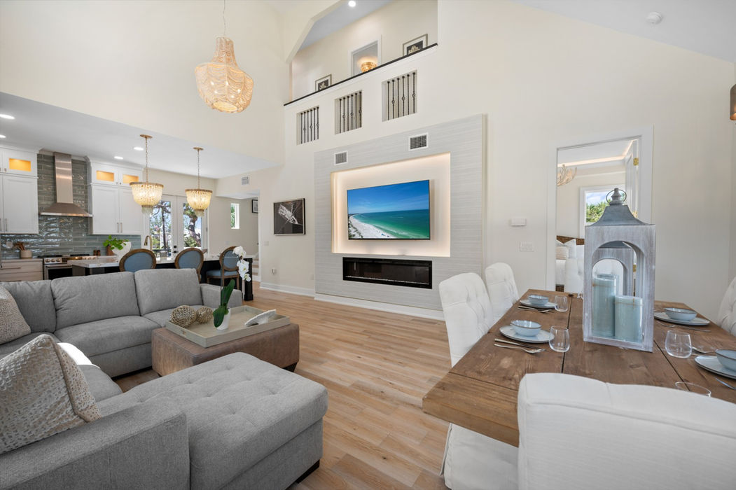 Inside, the main living space is open, airy, and bathed in natural light, with soaring ceilings and refined coastal décor. Gather in the stylish living room to stream your favorite shows, or share meals in the elegant dining area. The sleek chef’s kitchen is fully equipped with high-end appliances, quartz countertops, and everything you need to entertain with ease.