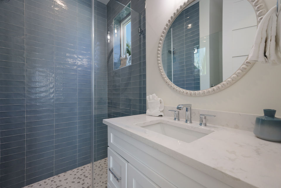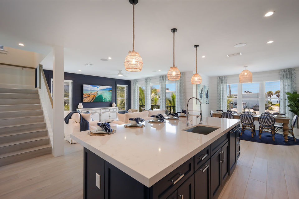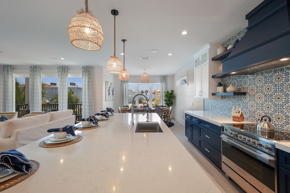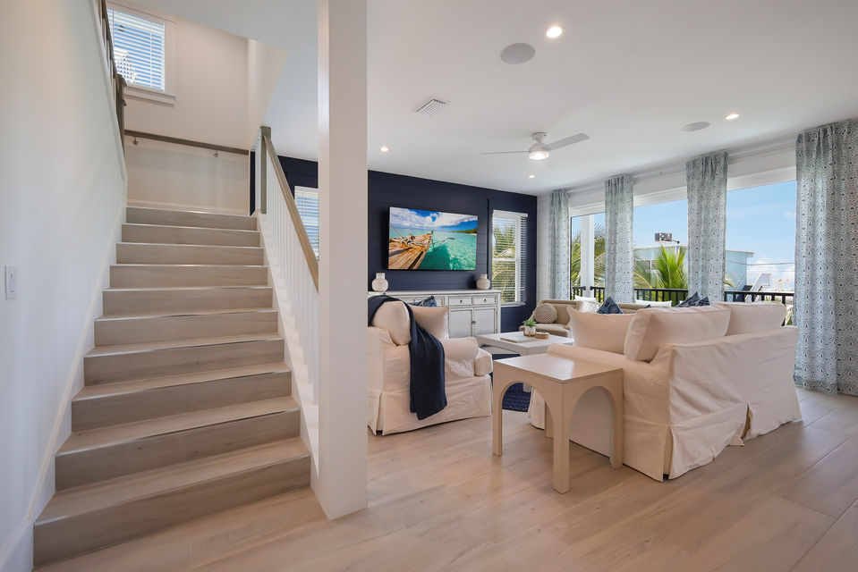 The main living level is bright, open, and thoughtfully designed for both togetherness and quiet moments. The open-concept kitchen, dining, and living space features coastal finishes, large windows, and direct access to an outdoor deck with a comfortable conversation area, perfect for morning coffee or evening cocktails. The chef-ready kitchen offers high-end appliances, stone countertops, and island seating for easy breakfasts or appetizers, while the dining area makes group meals effortless.